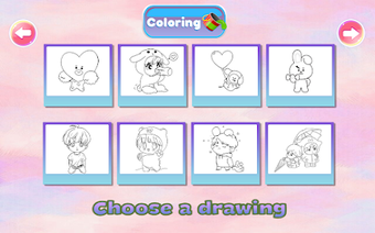 在这个应用程序中,您可以找到来自BT21团体的8个角色。他们是Shook,Mang,Chime,Taehyung,Koya,RJ和Jin。他们每个人都有独特的外观和个性。您还可以涂色代表他们的图标。
